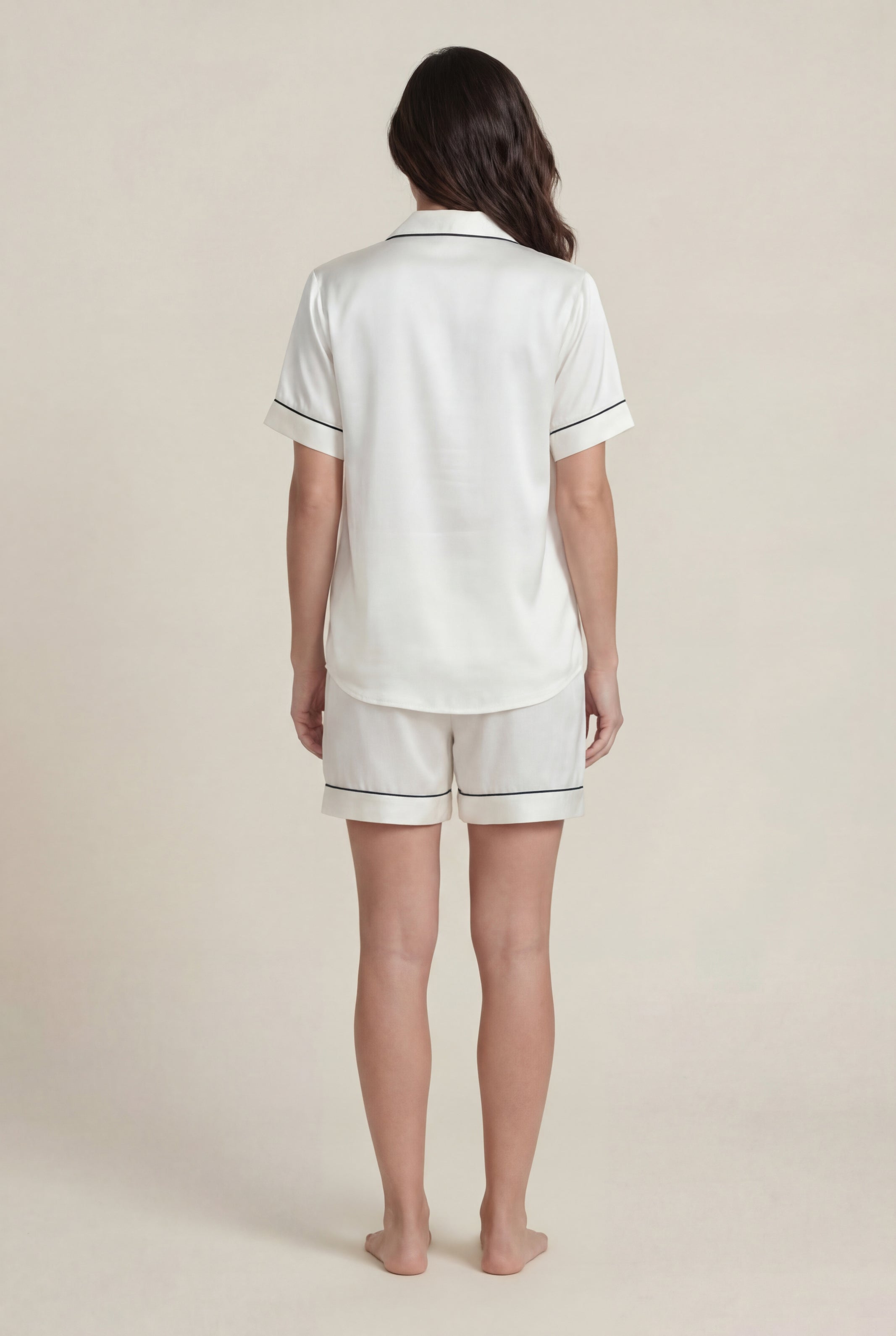Design Details: Relaxed notch-collar shirt with short sleeves, button-front closure, and a chest pocket embroidered. Black contrast piping outlines the collar, sleeves, pocket, placket, and hem. Matching shorts with the same piped trim sit at a comfortable mid-thigh length.
